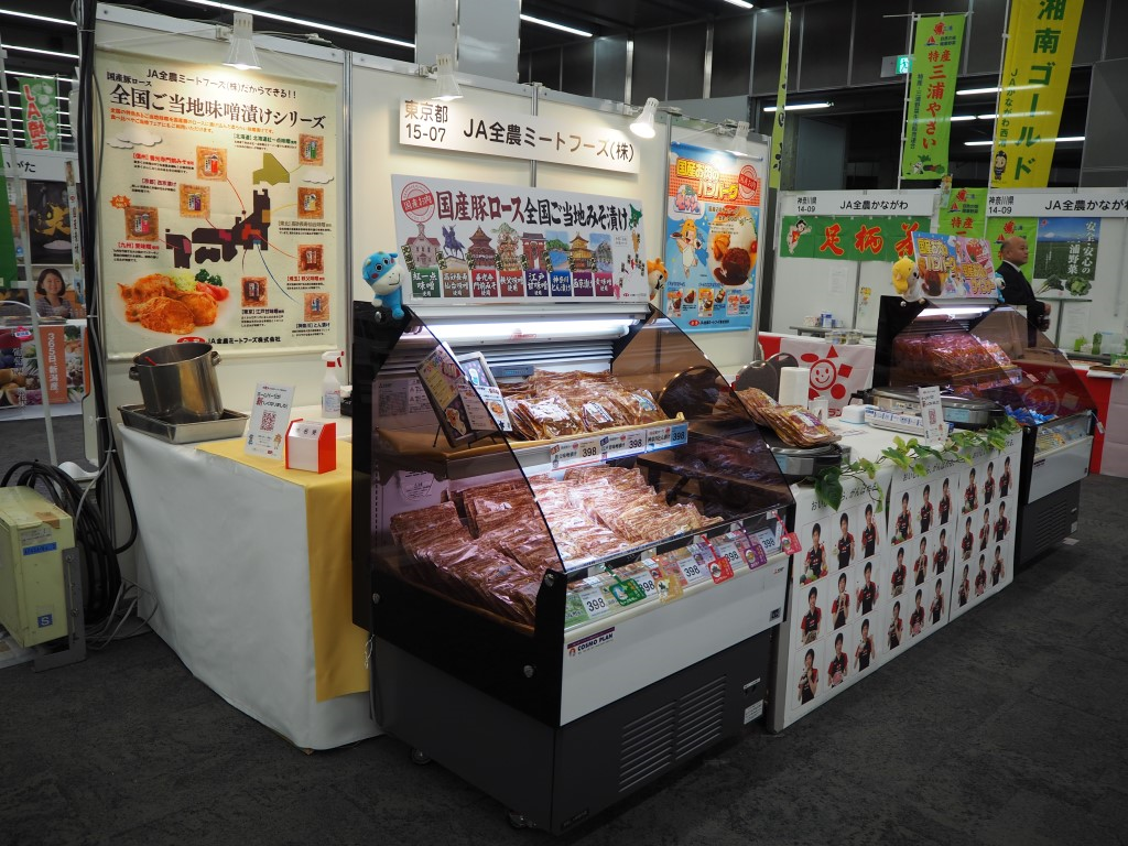 当社ブースでは、全農の公式キャラクターである「おにくだいすき!ゼウシくん」をパッケージに使用した「国産お肉のハンバーグ」と、 全国8ヶ所の特色あるご当地味噌を使用した「国産豚ロース全国ご当地味噌漬けシリーズ」を展示し、試食をおこないました。