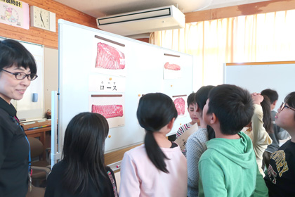 「お肉を知ろう」資料説明、県産和牛、豚肉試食、とりモーとの記念撮影