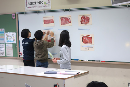 「お肉を知ろう」資料説明、県産和牛、豚肉試食