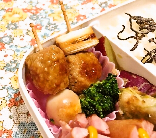 爪楊枝に刺したみにつくね串です。食べやすく、お弁当にぴったり!