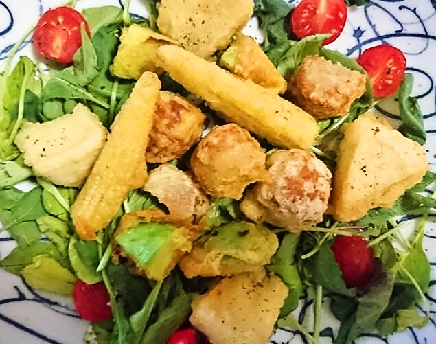 - 肉だんごと野菜に2の衣をつけ、170℃の油で揚げます。表面がカリッとするまで揚げたら完成。