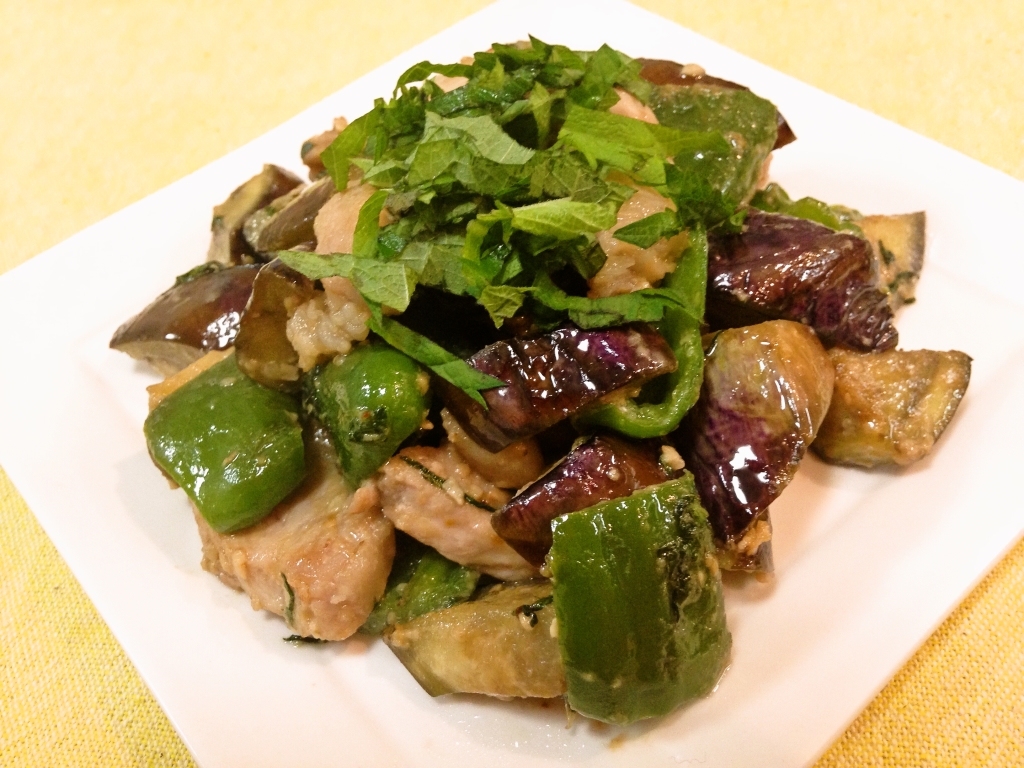 - ひとくちだいにカットした豚ロース炒め、ピーマン、大葉、3のナスを一緒に炒める