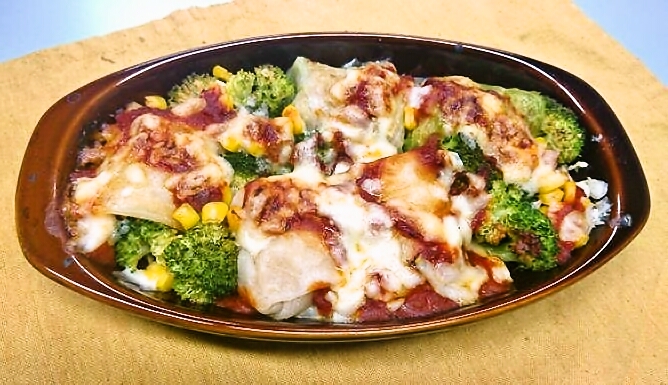 - 2の耐熱皿にスイートコーンとブロッコリーを盛り付け、上からトマトソースかけます。