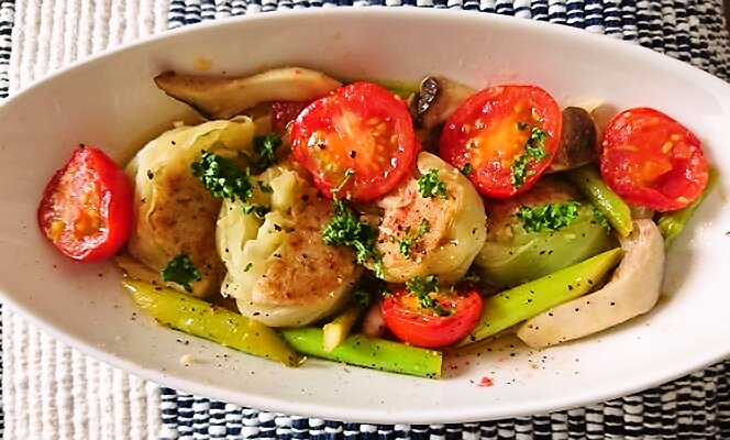 ロールキャベツをアクアパッツァ風に白ワインで煮込みました。肉と野菜の旨味が楽しめるおもてなし洋風料理です。