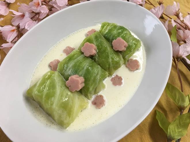 ロールキャベツのクリーム煮を簡単に!花型にくり抜いた魚肉ソーセージを添えて春らしい1品に。