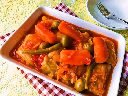 - 炊飯釜に凍ったままのロールキャベツ、カットした野菜、オリーブの実の塩水漬け、トマトの水煮缶、コンソメスープの素、塩、および水を入れ、通常モードで炊く。