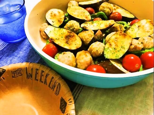 『肉だんごとたっぷり夏野菜のカレーマヨ炒め』